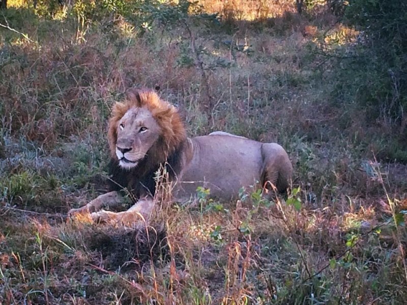 ขับออกไปแค่ 5 นาที ไกด์บอกนี่ไงรอยเท้าสิงโตมันน่าจะเพิ่งเดินผ่านไปไม่นาน แล้วพี่แกสองคนก็พาเราขับวนตามรอยเท้า พาขับพุ่งทะลุเข้าไปในพงหญ้าต้องคอยหลบกิ่งไม้กันพัลวัน มีการจอดรถแล้วลงไปเดินหากันสองคนด้วยนะ ปล่อยพวกเรานั่งงงงวยอยู่บนรถ ดีที่ยังเสียบกุญแจทิ้งไว้ให้ (ฮ่าๆ) ขับวนอยู่ซักพักไม่เห็นเจออะไร เริ่มคิดว่านี่เขากำลังแอคติ้งให้พวกเราตื่นเต้นรึเปล่านะ แบบบิ้วอารมณ์ผจญภัยในซาฟารีตามล่าหาสิงโตอะไรแบบนี้ แล้วจู่ๆพี่ไกด์ผิวสีก็พูดขึ้นว่า “ได้ยินมาว่าเมื่อเช้าสิงโตตัวผู้สองตัวเพิ่งล่าลูกควายไป กินเสร็จคงหิวน้ำน่าจะเดินไปทางแหล่งน้ำนะ” (โอ้โห มโนเรื่องเร้าใจได้อีก) พอขับๆไปซักพัก.. มองไปทางซ้าย.. โอ้ววววมายไลอ้อน!! ภาพที่เห็นคือสิงโตตัวผู้นั่งทำหน้าฟินกึ่งง่วงหลังเพิ่งกินอิ่มหมาดๆ โดยมีซากลูกควายซ่อนอยู่ในพุ่มไม้ข้างๆเป็นหลักฐานมัดตัว ไกด์พาขับไปจอดใกล้มาก ห่างแค่ 2 เมตรเท่านั้น!! มันก็มองๆเราแต่ไม่ได้สนใจอะไรแล้วก็ฟุบลงนอน เขาบอกว่าสัตว์ที่นี่มันชินกับรถซาฟารี แต่ห้ามยืน ห้ามยื่นมือไม้ ห้ามทำให้มันตกใจหรือประหม่า เพราะโดยสัญชาตญาณนักล่าเขาก็เตรียมพร้อมกระโจนใส่ตลอดเวลาเช่นกัน ในป่านี้มีสิงโตอยู่ 15 ตัว เอาน่า ได้เจอตัวนึงก็ยังดี ถ่ายรูปกันอย่างเงียบๆฟินกันไปกับ Big Five ตัวที่ 2 “Lion”