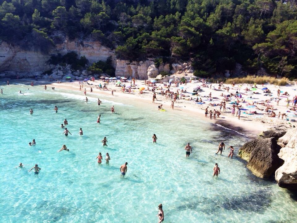 หาดแรกที่เราประทับใจมาตั้งแต่ทริปคราวก่อน มีชื่อว่า Cala Mitjana ณ ตอนนั้น มีความตื่นเต้นมากกับการเห็นหาดทรายขาวน้ำใสแจ๋วในยุโรปเป็นครั้งแรก หาดนี้จึงเป็นหาดที่อยู่ในความทรงจำไม่ลืม สำหรับคนรักความสะดวกสบายหรือมากันเป็นครอบครัว เขาก็มีหาดขนาดใหญ่ขึ้นมาหน่อยที่มีเตียงผ้าใบไว้คอยบริการ หรือมีบาร์และร้านอาหารใกล้ๆ ขอแนะนำให้มุ่งไปที่ Cala Galdana และ Cala en Bosch รับรองว่าไม่ผิดหวังค่ะ