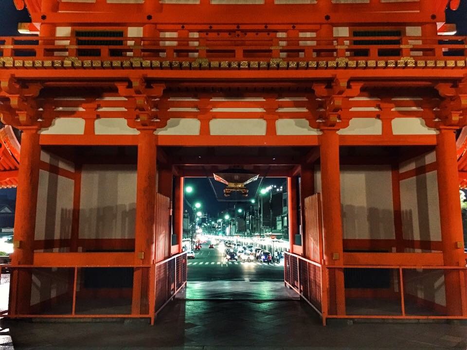 เพียงเดินไปสุดถนน Shijō-dōri เราก็จะเห็นประตูไม้สีส้มความสูงเกือบสิบเมตรของศาลเจ้ายาซากะ Yasaka Shrine 「八阪神社」ตั้งเด่นอยู่ตรงหน้า สำหรับเราประตูนี้เปรียบเสมือนประตูทะลุมิติของโดราเอมอนที่พาเราย้อนข้ามเวลาไปในสมัยเอโดะ โคมไฟนับร้อยที่ห้อยเรียงราย รูปปั้นหินของเหล่าเทพเจ้า บรรยากาศรอบตัวและผู้คนที่เดินกันขวักไขว่ในชุดกิโมโน ทำให้เราลืมไปชั่วขณะถึงความวุ่นวายหลังประตูบานนั้น ว่ากันว่าที่ตั้งของศาลเจ้ายาซากะแห่งนี้เป็นจุดรวมพลังงานดี ผู้คนจึงนิยมมาไหว้ขอพรทั้งในเรื่องการค้าและความรัก