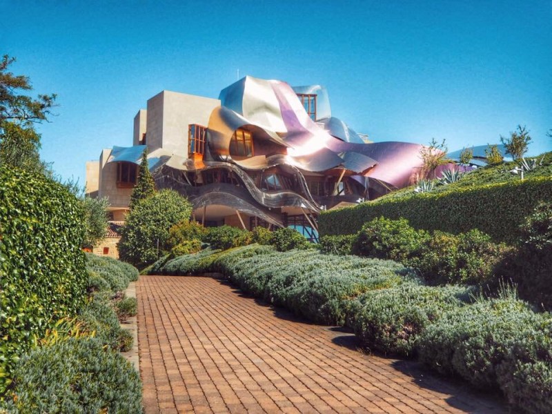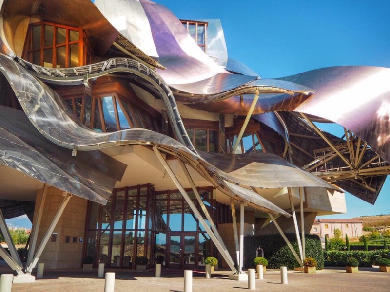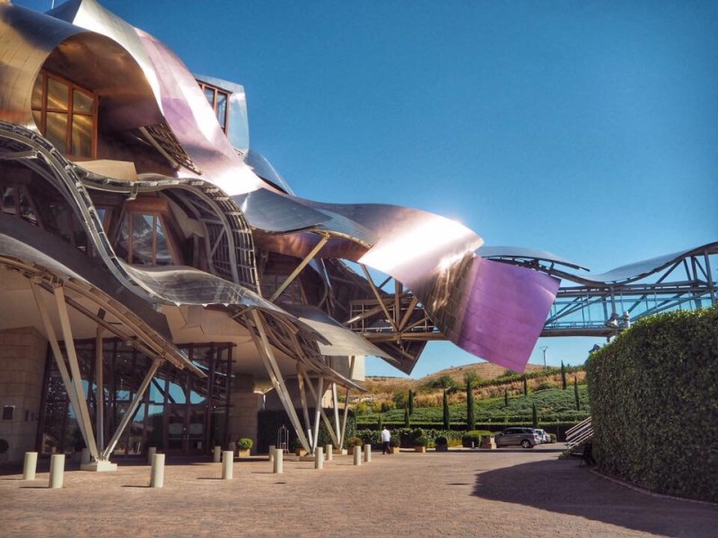 คืนถัดมาเรายังอยู่ในแคว้นริโอฮะแต่ย้ายมาอีกโรงแรมหนึ่งซึ่งอยู่ใจกลางเมืองเข้ามาหน่อย Hotel Viura เป็นอีกหนึ่งโรงแรมที่ตกแต่งได้เก๋ถูกใจในสไตล์โมเดิร์นอาร์ต ห้องอาหารชั้นล่างก็ทำได้ดีทีเดียว วันรุ่งขึ้นก่อนจะอำลาแคว้นไวน์แห่งนี้ เราได้จองมื้อกลางวันไว้ที่โรงแรม Marques de Riscal โรงแรมหรูกลางไร่องุ่น ที่ออกแบบโดยสถาปนิกสุดติสต์ฝีมือฉมัง Frank Gehry งานออกแบบของเขาทุกชิ้นมีเอกลักษณ์โดดเด่นไม่เหมือนใคร มักเป็นที่กล่าวขวัญถึงเสมอ อย่างเช่น Guggenheim Museum ที่เมือง Bilbao (ดิฉันนี่ก็แฟนตัวยง) แค่แวะมาดูตัวอาคารก็คุ้มเกินคุ้มละค่ะ อาคารรูปทรงยูนิคสีม่วง-เงินขนาดมหึมาผุดขึ้นมากลางสวนกลางไร่ สวยฉีกทุกกฎ ทั้งยังเพิ่มมูลค่ามหาศาลให้กับเมืองชนบทเล็กๆ เกิดเป็นข้อคิดว่ามนุษย์เราถ้ารู้จักสร้างสรรค์ในทางที่ถูกที่ควร ไม่เบียดเบียนแต่เปลี่ยนมาเป็นส่งเสริม เราก็จะอยู่ร่วมกันกับธรรมชาติได้อย่างกลมเกลียว (อ่ะ จบสวย!)